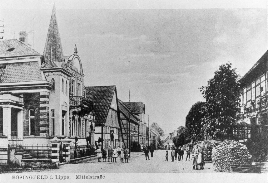 Ansichtskarte von der Mittelstraße in Bösingfeld (Zeit?), links im Bild das Haus der Familie des Arztes Dr. Heinrich Schleyer. Erbauer war H. Linnemann.
