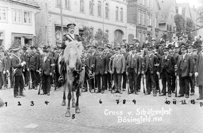 Schützenfest in Bösingfeld 1910. Nr.5: Adjutant Moritz Frankenstein, Nr.7: David Kleeberg Quelle: GA 2322