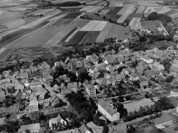 Luftbildaufnahme Bösingfelds (Zeit?) Darauf zu sehen ist noch das Synagogengebäude (Pfeil).