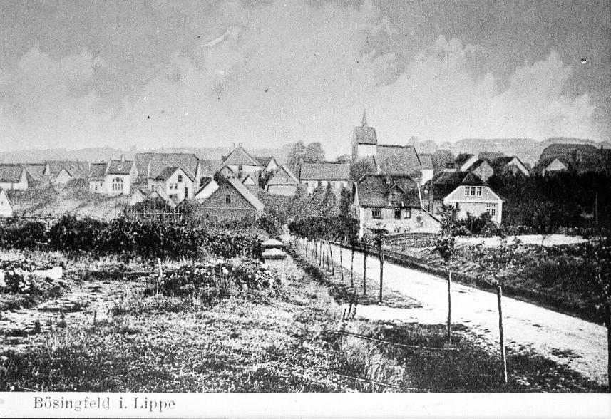 Postkarte mit südlicher Ansicht des Bösingfelder Ortskerns von 1919. Links mit Rundbogenfenster ist die Synagoge zu sehen. Quelle: GA B0819