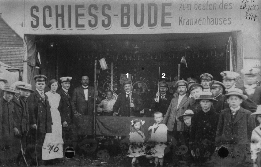 Immer wieder wurden Jahrmärkte und Basare zugunsten eines geplanten Krankenhauses in Bösingfeld veranstaltet (hier: 20.07.1914). Das Krankenhaus sollte auf dem Sportplatz in der Mittelstraße errichtet werden. An dieser gemeinnützigen Aktion waren auch jüdische Mitbürger beteiligt. Nr. 1 David (oder Julius?) Kleeberg und Nr. 2 der Lehrer Benjamin Katz.