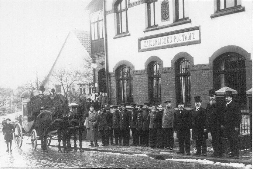 Kaiserliches Postamt untere Mittelstraße, heute Bäckerei Dreimann. Abfahrt von Bösingfeld mit der letzten Post 1916. 2. v. rechts Bürgermeister Friedrichs, links daneben Julius Kleeberg